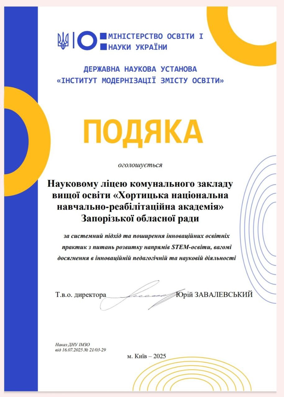 Досвід роботи нашого закладу відзначено в межах Всеукраїнського заходу «Ми реалізуємо STEM». Це визнання підтверджує, що ми рухаємось у правильному напрямку, впроваджуючи сучасні підходи до навчання та відкриваючи для дітей нові горизонти у світі науки й технологій.