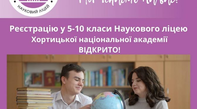 Чекаємо здобувачів освіти, які закінчили 4-8 класи та випускників 9 класів закладів загальної середньої освіти міста Запоріжжя, Запорізької та інших областей України. Відкрито набір до 5-9 та 10-х профільних (суспільно-гуманітарного, природничо-математичного, техніко-технологічного) класів Наукового ліцею комунального закладу вищої освіти «Хортицька національна навчально-реабілітаційна академія» Запорізької обласної ради.